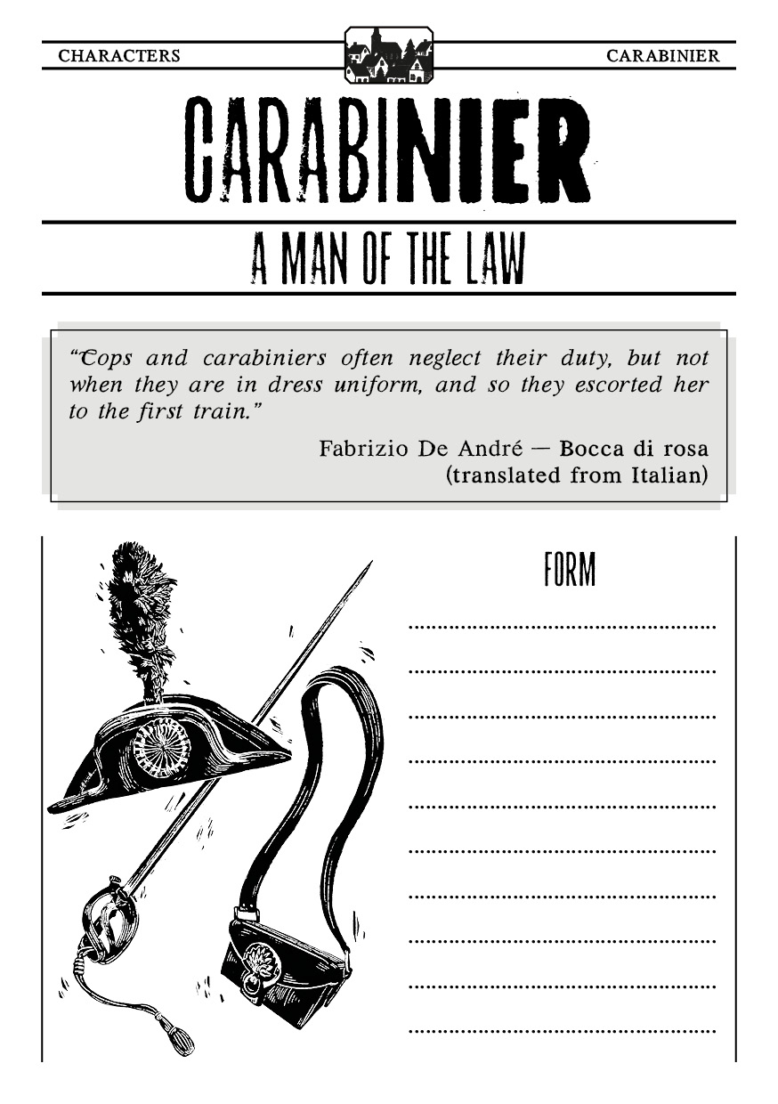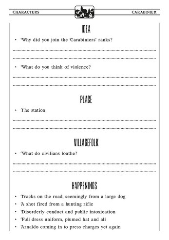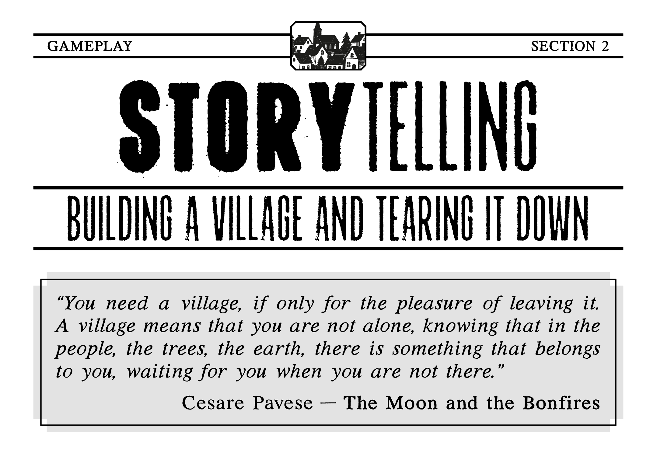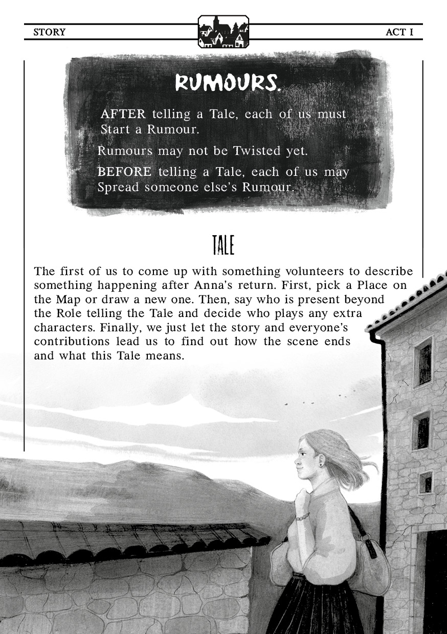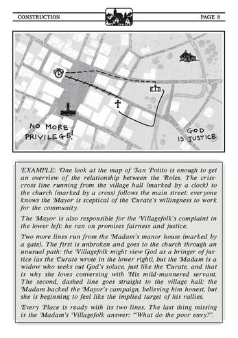 The game begins by choosing Roles from a selection of notable villagers such as the mayor, innkeeper or local brigand. As you build your characters, you also construct the village around them by drawing out key buildings onto a map, answering questions about the general feelings of the villagefolk, and tracing an intricate web of relationships.