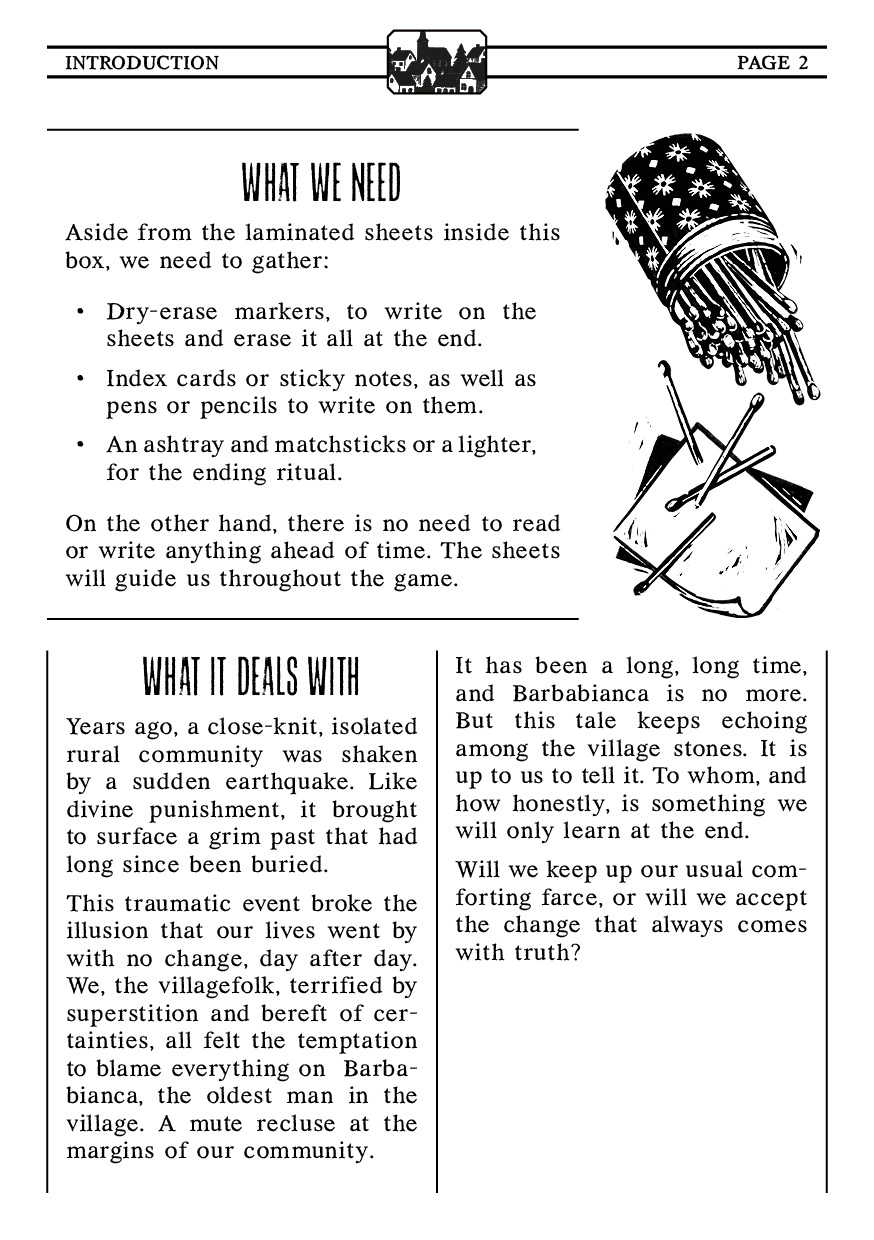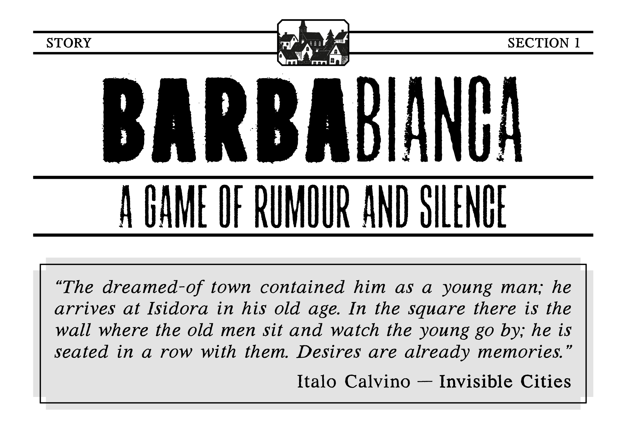 Barbabianca is a collaborative storytelling game for 3-4 players designed by Cristian Sisto. It is a game about treacherous memories and poisoned words. About how hard times and easy answers can destroy a community.